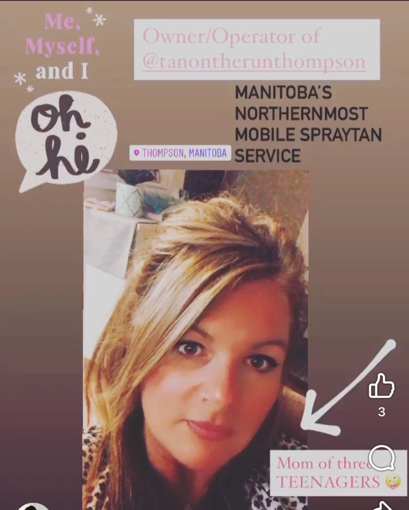 Bella-Lena sent me this pic yesterday, it’s from 2020, had tried to go blonde back then too until the “code red” of Covid restrictions shut salons down completely and I went back to dyeing my hair with a box dye…the photo was when I was doing spraytans and was meant for my social media accounts, I think my boss had us do this little “introduce yourself” kind of post to increase traffic